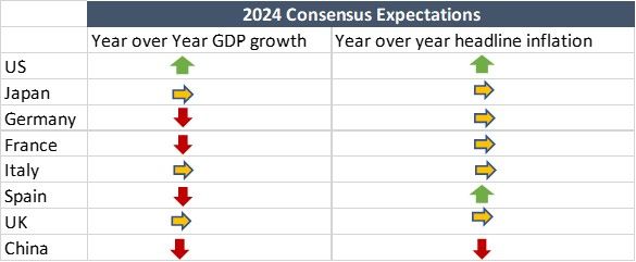 So könnte die Federal Reserve (Fed) die Zinsen für längere Zeit auf einem höheren Niveau belassen – anders als beispielsweise die Bank of England. Die britische Wirtschaft zeichnet sich durch eine kürzerfristige Struktur der Hypothekenkredite aus und besitzt insgesamt eine höhere Zinssensitivität. Dadurch wirken sich Zinserhöhungen früher auf die Wirtschaft aus und führen zu einer Abschwächung. Die Eurozone konnte im Jahr 2023 eine Rezession vermeiden, was teilweise dem milden Winter zu verdanken war. Dieser ermöglichte es, auch ohne russische Lieferungen die Energiekosten niedrig zu halten. Möglicherweise wiederholt sich das auch im Jahr 2024.