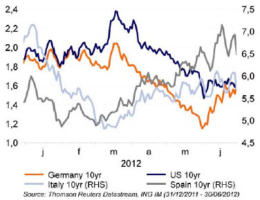 Das erste Halbjahr 2012 stand stark im Zeichen der Eurokrise. Im März wurde mit Unterstützung von Anlegern die komplexe Restrukturierung der griechischen Staatsverschuldung abgeschlossen, wodurch die europäischen Regierungschefs das zweite Rettungspaket für die Hellenen verabschieden konnten. Das Risiko einer Systemkrise im Euroraum sei dadurch erheblich verringert worden, geht aus dem Halbjahresbericht 2012 von ING Investment Management hervor. Dies verhinderte jedoch nicht, dass sich die Eurokrise zunehmend auf die Wirtschaft auswirkte: „Die Kreditvergabe der Banken blieb niedrig, und das Geschäfts- und Verbrauchervertrauen wurden durch die anhaltende Unsicherheit und die Aussicht auf strikte Sparmaßnahmen im gesamten Euroraum gedämpft“, so der Bericht. Die Turbulenzen seien durch zunehmenden Populismus in Süd- und Nordeuropa angeheizt worden. Die Parlamentswahlen in Griechenland drohten zu einem Referendum über den Verbleib des Landes in der Eurozone zu werden – über einen Austritt wurde offen diskutiert. Nach dem Wahlsieg der proeuropäischen Parteien stehe das Thema derzeit aber nicht mehr auf der Agenda. Stattdessen geriet im zweiten Quartal des Jahres Spanien unter Druck: „Es kamen Zweifel daran auf, ob das Land seine Haushaltsziele erreichen kann“, schreiben die ING-Experten. Zudem habe die Besorgnis um den Bankensektor zugenommen, der durch die Immobilienkrise des Landes ernsthaft in Mitleidenschaft gezogen worden sei. Der Druck auf Spanien konnte beim EU-Gipfel im Juni durch die Vereinbarung gemildert werden, dass die Banken des Landes direkt Kapital vom europäischen Rettungsfonds ESM erhalten dürfen.