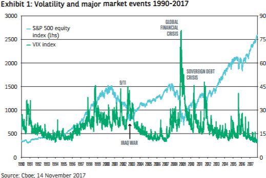 The fact is that market volatility is now exceptionally low. The VIX hit an historic trough in September 2017 at 9.51 (see Exhibit 1). Rather than looking at the implicit volatility measure based on options prices, one could also look at realised volatility. Here too, what we see is clear: at the end of September 2017, the historical volatility of the S&P 500 stock index over a rolling one-year period was 7.7. To put this figure into perspective, such volatility is not so far from that of long-maturity government bonds. This concerns data for the US market, but the same low-volatility phenomenon applies to both other equity indices – for the European market, the VStoxx index also recently hit an historic low – and to asset classes such as bonds and currencies. We are faced with a global trend: volatility is simultaneously low across a broad spectrum of regions and assets.