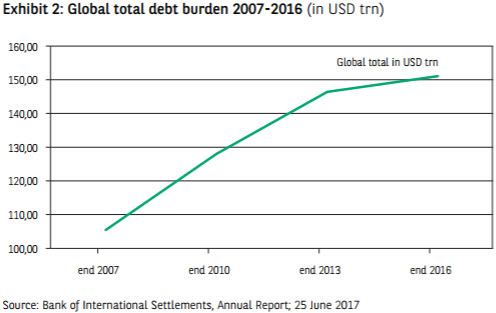 At the same time, maintaining interest rates at accommodative levels over a relatively long period has led many companies to increase their debt loads, taking advantage of the favourable terms for financing. This is particularly apparent in the US, where many listed companies have entered into extensive share buyback programmes, but also in China, where the ratio of corporate private debt to GDP increased from 99.8% in 2008 to 158.6% at the end of 2016. This widespread increase in debt (see Exhibit 2) goes hand in hand with a deterioration in the quality of company balance sheets. For us, this is the second factor that could contribute to a rise in volatility. The price of risk must be linked to the greater or lesser vulnerability of private sector companies to a fall in revenues or increase in interest rates. On this point, we recall the work of Nobel laureate Robert Merton, among others, on the link between corporate debt and the volatility of equities.