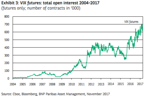 Over the same period, financial engineers have developed a range of derivative products linked to VIX futures that allow investors to take positions anticipating a rise or fall in the VIX. Financial products that structurally sell implied volatility indices have seen significant inflows in the wake of the strong performance of equity marketsin recent years (see Exhibit 3). As the VIX fell, this paid off handsomely. Such products and other forays into new territory in the search for yield are nevertheless vulnerable to reversals of the trend. Assuming that the cycle begins to turn, one can expect pro-cyclical behaviour by some market participants, mechanically accelerating the pace of sales.