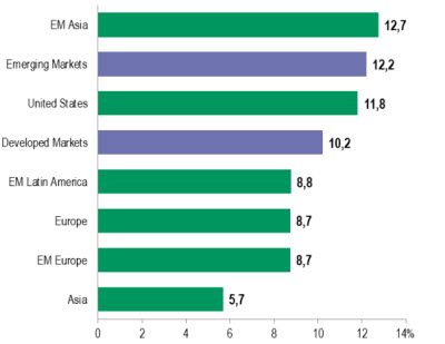 Ermutigend ist allerdings, dass für 2018 ein geringeres Gewinnwachstum erwartet wird als für 2017: Nach 12% Wachstum 2017 werden für die Industrieländer 2018 nur noch 10% prognostiziert. Bei Emerging-Market-Unternehmen liegen die Wachstumserwartungen für 2018 bei 12%, gegenüber 22% im Jahr 2017. Selbst wenn die Prognosen noch gesenkt werden, darf man aus unserer Sicht getrost davon ausgehen, dass die Unternehmensgewinne 2018 steigen und die Märkte bei konstanten KGVs zulegen.