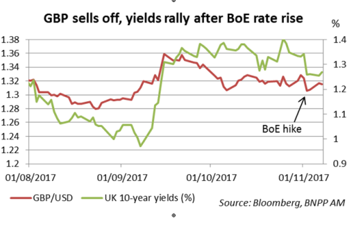 Indeed, the previously hawkish tone of the BoE had induced many investors to price in not only one rate rise, but a whole tightening cycle running into 2018. As a result, the market reaction was the opposite of what a rate rise usually implies: the gilt market rallied and sterling sold off. That said, as our Macro Team notes, the BoE still managed to tighten financial conditions compared to August levels.