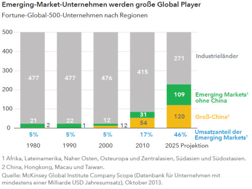 Auch bei den Unternehmen tut sich eine Menge. Viele Emerging-Market- Unternehmen sind heute internationale Marktführer. In den 1980er-Jahren kamen nur etwa 5% der Unternehmen im Fortune Global 500 – dem Index der weltweit umsatzstärksten Unternehmen – aus den Schwellenländern.