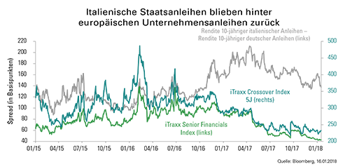 Staatsanleihen der europäischen Peripherieländer beurteilen wir positiv, da sich deren Spreads mittelfristig verengen dürften. Insbesondere die italienischen Spreads gegenüber deutschen blieben deutlich hinter den gesunkenen Risikoprämien in anderen europäischen Anlageklassen zurück, sogar bei italienischen Aktien und nachrangigen Bankenanleihen. Wir sind der Auffassung, dass die Ausweitung der Spreads zwischen 10-jährigen italienischen und deutschen Staatsanleihen von dem Tiefpunkt von etwa 90 Bp. im März 2015 auf derzeit 150 Bp. übertrieben ist. Wegen politischer Bedenken, die wieder nachlassen dürften, vor allem da das neue Wahlgesetz die Extremrisiken verringert hat, wird Italien von der sich ausweitenden Konjunkturerholung und den zunehmenden politischen Bemühungen für eine verstärkte und schnellere Integration in der Eurozone profitieren.