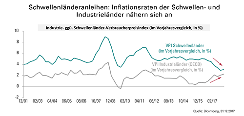 Außerdem sind wir noch immer davon überzeugt, dass Schwellenländeranleihen interessante Chancen bieten: Sie werden durch das globale wirtschaftliche Umfeld, ein für Rohstoffpreise günstiges Umfeld und vor allem durch sich verbessernde Fundamentaldaten in mehreren Schwellenländern unterstützt. Während wir in Industrieländern auf Anzeichen für ein Anziehen der Inflation achten, beobachten wir zudem in den meisten Schwellenländern den entgegengesetzten Trend hin zu einer Disinflation, so etwa in Brasilien. Dies ermöglicht es den Zentralbanken, die Zinssätze zu senken. In unserer Länderallokation werden „Value-Positionen“ wie Mexiko und Brasilien, die eine attraktive Prämie für das politische Risiko bieten, und einige Carry-Strategien wie Russland und Indonesien kombiniert.
