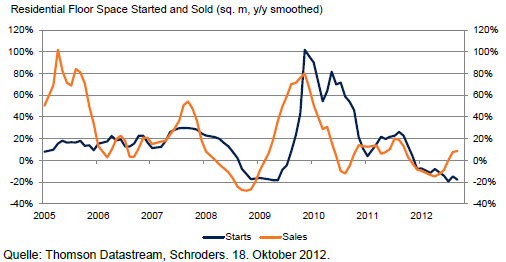 Insgesamt dürften sich die jüngsten Entwicklungen in China positiv auf Risikoanlagen auswirken, vor allem auf denen, die stark von einem Wachstum Chinas profitieren. Das sind zum Beispiel der DAX, Schwellenmarktaktien und Rohstoffwährungen wie der australische Dollar. Es gibt eindeutige Hinweise, dass das dritte Quartal den Tiefpunkt des chinesischen Wachstumszyklus markiert hat. Zudem existieren Indizien, die bis zum Jahresende und darüber hinaus in das Jahr 2013 hinein auf Stärke schließen lassen. Auf 12-Monats-Sicht bleiben jedoch Abwärtsrisiken für das Wachstum bestehen, die in erster Linie auf eine weitere Verschlechterung der Stimmung und Makrodaten im Ausland (in der Eurozone oder in den USA wegen der Fiskalklippe) sowie auf einen weiteren Abschwung am heimischen Wohnungsmarkt zurückgehen, sollte die notwendige geldpolitische Unterstützung ausbleiben.