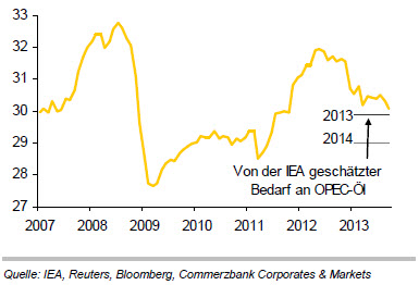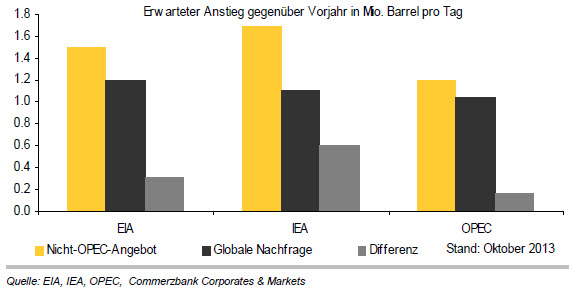„Der Ölmarkt bleibt auch 2014 reichlich versorgt, was sich dämpfend auf den Ölpreis auswirken sollte“, erwartet Eugen Weinberg, Leiter Commodity Research bei der Commerzbank, in der aktuellen Studie „Reichliches Angebot dämpft weitere Ölpreisentwicklung“. Die globale Ölnachfrage im kommenden Jahr dürfte zwar etwas stärker steigen als in diesem Jahr. „Die Schätzungen der Internationalen Energieagentur IEA, der US-Energiebehörde EIA und der OPEC liegen bei einem Nachfrageanstieg um 1,0 - 1,2 Millionen Barrel pro Tag, nach knapp eine Million Barrel pro Tag im laufenden Jahr“, so Weinberg. Das Angebot außerhalb der OPEC soll laut IEA aber um 1,7 Millionen Barrel pro Tag steigen und damit den erwarteten Nachfragezuwachs um ca. 600.000 Barrel pro Tag übertreffen. EIA und OPEC lägen mit ihren Schätzungen zwar etwas darunter. Keine der drei Agenturen erwarte allerdings, dass die globale Nachfrage 2014 stärker steigen wird als das Angebot von Nicht-OPEC-Ländern. Letzteres wäre allerdings nötig, damit sich der globale Ölmarkt einengt.