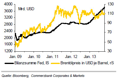 Von der Nachfrageseite erwartet Weinberg keine großen Überraschungen auf die Preise. Sie dürfte weiterhin von den Schwellenländern wie China, Indien und Brasilien getragen werden, während die Ölnachfrage in den Industrieländern eher weiter schrumpfen werde. „Für etwas Ungewissheit bei der Preisentwicklung sorgt die Geldpolitik der Zentralbanken“, sagt der Studienautor. „Es ist zwar davon auszugehen, dass die US-Notenbank ihre ultra-lockere Geldpolitik im kommenden Jahr schrittweise zurückführen wird. Allerdings konnten die Ölpreise vom seit Ende 2012 laufenden dritten Anleihekaufprogramm kaum profitieren, so dass eine graduelle Reduzierung der Anleihekäufe den Ölpreis nicht nennenswert belasten sollte.“ Hinzu komme, dass die globale Geldpolitik auch danach ausgesprochen expansiv bleibe. „Angesichts niedriger Zinsen und einer fallenden Brent-Terminkurve bleibt Rohöl für Anleger somit interessant.“