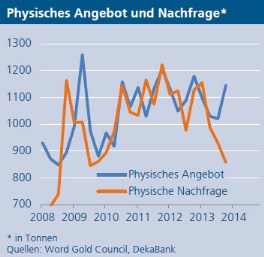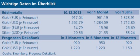 Die Krisenwährung Gold habe zudem mit der nachlassenden Brisanz der europäischen Staatsschuldenkrise zu kämpfen. Ein Ende der ultra-lockeren Geldpolitik der Notenbanken werde ihn weiter sinken lassen. „Eine solche Wende zeichnet sich bis Ende 2015 jedoch nur in den USA ab“, erwartet Hepperle. „Nach der im Frühjahr 2013 erfolgten kräftigen Preiskorrektur rechnen wir nicht mit einem weiteren dramatischen Absturz der Goldnotierung.“ Dass die Notenbanken der Schwellenländer ihre Goldbestände zur Diversifizierung ihrer Währungsreserven weiter aufstockten, wirke stützend auf den Preis des Edelmetalls. Die physische Goldnachfrage verlagere sich zudem verstärkt von Nordamerika und Europa nach Asien. „Auch dies spricht gegen einen ausgeprägten Preisverfall“, begründet Hepperle. Dennoch: „Auf lange Sicht trauen wir dem Goldpreis nicht viel mehr als einen Inflationsausgleich zu.“ In sechs Monaten erwartet der Deka-Experte den Preis je Feinunze bei 1.220 US-Dollar, in einem Jahr bei 1.150 US-Dollar.