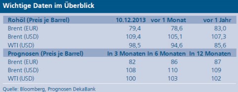 Der Preis für Rohöl ist in den vergangenen vier Wochen gestiegen: „Der hohe Brent-Preis von rund 110 US-Dollar je Fass wird durch die seit Monaten anhaltenden Lieferstörungen in Libyen gestützt“, begründet Hepperle. „Für etwas höhere Preise bei der US-Sorte WTI sorgte der spürbare Rückgang bei den US-Rohölreserven.“ Der Preisabstand zwischen beiden Sorten habe sich zwar eingeengt, bleibe aber vergleichsweise groß. Der Internationalen Energieagentur (IEA) zufolge, werden die USA im Jahr 2015 aufgrund der raschen Produktionsausweitung bei Schieferöl („Fracking“) zum weltgrößten Ölproduzenten aufsteigen. Diese Angebotsausweitung drücke auf den WTI-Preis. Angebotssorgen im Zuge der Entwicklung in Afrika (Nigeria, Libyen, Sudan) und im Nahen Osten (Iran, Irak, Syrien) hingegen stützten den Brent-Preis. „Für die kommenden Monate rechnen wir für Brent mit einer Notierung um 110 US-Dollar je Barrel“, so Hepperle. „Der WTI-Preis dürfte mit rund 100 US-Dollar deutlich darunter liegen.“