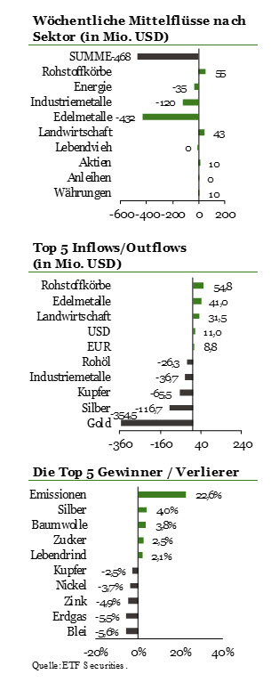 Landwirtschafts-ETPs (A0KRKB) zogen in der letzten Woche Gelder in Höhe von 43,3 Mio. USD an. Mexikos Südküste wurde am letzten Freitag von einem massiven Erdbeben der Stärke 8,1 erschüttert, dem ein Tsunami folgte. Dies gefährdet Arabica-Kaffee aus der Region Mittelamerika, die immerhin für 20 Prozent der globalen Kaffeeproduktion verantwortlich ist. „Die Schäden könnten die anstehende Oktober-Ernte in Mexiko verzögern und die Kaffeepreise aufwärts treiben“, so abschließend Hein.