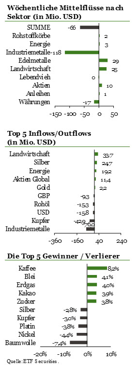 Nach den hohen Abflüssen verzeichneten Edelmetalle in der vergangenen Woche wieder Zuflüsse, und zwar in Höhe von 29 Mio. USD. Bei Industriemetallen kam es erneut zu Abflüssen. Landwirtschafts-ETPs zogen in der letzten Woche Gelder in Höhe von 25 Mio. USD an, sodass sich die Zuflüsse seit Jahresanfang auf 248 Mio. USD summieren.