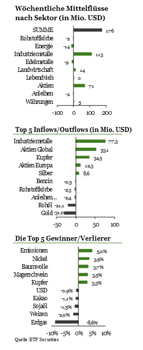 Industriemetall-ETPs (A0SVX7) verzeichneten die höchsten wöchentlichen Zuflüssen seit Sommer 2014. In der vergangenen Woche lagen sie mit einem wöchentlichen Rekordzufluss von 112,9 Mio. USD, dem höchsten seit August 2014, an der Spitze unserer Tabelle. Vor allem die Engagements in den Rohstoffkorb und in Kupfer wurden erhöht, und zwar um 77,3 Mio. USD beziehungsweise 34,5 Mio. USD. Was die Preisentwicklung anbelangt, so schnitt Nickel mit einem Plus von 4 Prozent am besten ab, gefolgt von Kupfer, das 3,3 Prozent zulegte, da die jeweiligen internationalen Studiengruppen gemeldet hatten, dass das Angebotsdefizit der beiden Metalle höher als im letzten Jahr ausfallen werde. Daneben zeigten die Anleger eine Reaktion auf den Klimawandel. Der jüngste Bericht des Global Carbon Project sagt für dieses Jahr einen Anstieg der Kohlendioxidemissionen um 2 Prozent voraus, was die Einhaltung des globalen Zielwerts von 1,5 °C unwahrscheinlich werden lässt. „Wir halten zusätzliche Investitionen in grüne Projekte, erneuerbare Energien und Elektrofahrzeuge für sehr wahrscheinlich. Dadurch könnte ein langfristiger Trend einsetzen, der Kupfer, Nickel und anderen Basismetallen zugutekommt“, meint Jan-Hendrik Hein, Director – Head of German Speaking Regions von ETF Securities.
