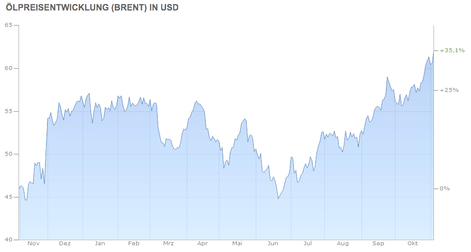 Der Ölpreis hat ein neues Jahreshoch erreicht: Die US-Sorte WTI notiert zur Zeit bei 56,12 US$ pro Barrel und steht damit 25 Prozent höher als vor 12 Monaten. Brent hat im selben Zeitraum sogar um 35 Prozent zugelegt und kostet aktuell 62,66 US$ je Fass.