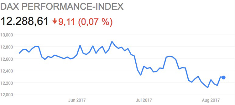 Der DAX gibt zum Wochenbeginn leicht nach und verliert 0,07 Prozent auf 12.288 Punkte. Ein leichter Kursrückgang des Euros erweist sich dabei nicht als hilfreich: Die europäische Gemeinschaftswährung notiert mit 1,1788 US$ – Mitte vergangener Woche stand sie zeitweise bei 1,19 US$. Der günstigere Eurokurs gibt vor allem der Exportwirtschaft Rückenwind.