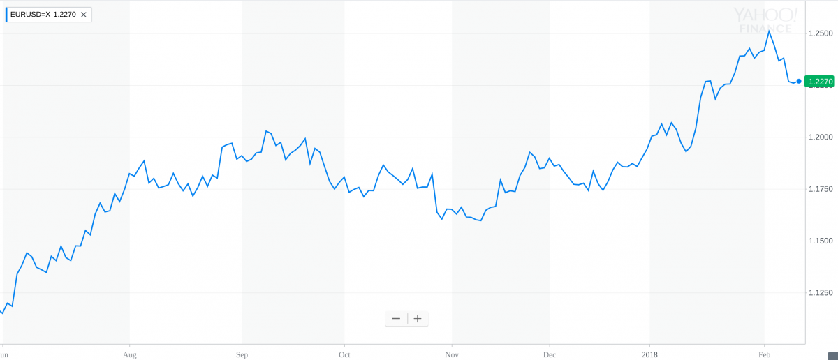 Die europäische Gemeinschaftswährung steuert im frühen Handel auf 1,23 US$ zu. Anfang Februar hatte der Euro zum ersten Mal seit vier Jahren wieder die Marke von 1,25 überschritten – um bis Ende Dezember 2016 beinahe Parität zum Dollar herzustellen. Seitdem hat der Kurs beständig angezogen, sehr zum Leidwesen der europäischen Exportindustrie, deren Ausfuhren sich im Verlauf des vergangenen Jahres um rund zwanzig Prozent verteuert haben.