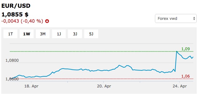 Der parteilose Quereinsteiger und ehemalige Wirtschaftsminister Emmanuel Macron liegt nach der ersten von zwei Wahlen vorn, am 7. Mai findet der entscheidende zweite Wahldurchgang statt. Macron ist erklärter Freund der EU und des Euros, sein (vorläufiger) Sieg über Europa-Gegnerin Marine Le Pen hat den Euro am Sonntagabend gleich um zwei Cent in die Höhe geschickt.