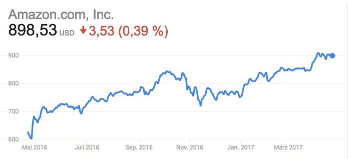 Vor allem das Quartalsergebnis von Amazon wird mit Spannung erwartet: Die Aktie des Handelskonzerns legte im ersten Quartal rund 20 Prozent zu. Dabei erreichte der Umsatz im vergangenen Jahr nur 43,7 Milliarden US$ – Analysten hatten 44,7 Milliarden erwartet. Traditionsgemäß macht Amazon noch immer kaum Gewinne: Das Ergebnis je Aktie lag zuletzt bei 4,90 US$, das Papier wird derzeit mit einem KGV von sage und schreibe 183 bewertet.