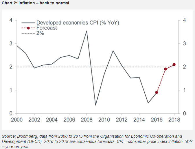 While the trend in global growth remains fairly steady, inflation in the major economies is making a v-shaped rebound. Consensus forecasts predict that inflation in the developed economies should reach 2% this year for the first time since 2012. A key reason for the improving outlook is the stabilisation of commodity prices, which have been depressing headline inflation (which includes food and energy) for the last couple of years. The return of inflation to more normal levels in 2017 will boost nominal growth (that unadjusted for inflation) and corporate earnings. It may also erode support for the ‘secular stagnation’ (prolonged slow growth) narrative that has been widely embraced of late. Furthermore, while underlying inflation remains subdued in the eurozone and Japan, wages and prices are recovering more broadly in the US, which means that any further inflation surprises there will probably put upwards pressure on interest rate expectations.
