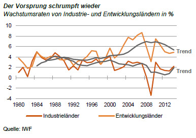 Die Entwicklung ist nicht zufällig. In den Industrieländern wirken sich die Reformen und Strukturbereinigungen nach der großen Finanzkrise aus. Die Wirtschaft dieser Staaten steht heute auf wesentlich gesünderer Basis. In den Entwicklungsländern gab es nach der Krise keinen solchen Erneuerungsschub.Die Infrastruktur in vielen Ländern Afrikas, Asiens und Lateinamerikas hat sich im Gegenteil weiter verschlechtert und muss ausgebaut werden. Der Rechtsrahmen der Volkswirtschaften muss verbessert und den sich ändernden Gegebenheiten angepasst werden. Korruption muss bekämpft werden. Die Bevölkerung fordert in vielen Staaten eine größere Teilhabe an dem entstandenen Wohlstand.