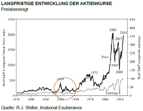 Man kann das auch an der ganz langfristigen Entwicklung sehen. Die Grafik zeigt die Entwicklung der Börse und der Unternehmensgewinne in den USA in den letzten 150 Jahren. Sie stammt aus der Neuauflage des Buches von Robert J. Shiller "Irrational Exuberance". Dabei sieht man, dass die Börsen in politisch besonders schwierigen Zeiten keineswegs immer schlecht liefen. Die Jahre 1932 bis 1937 etwa waren politisch die vielleicht schlimmste Zeit des Jahrhunderts mit dem Nationalsozialismus und den Vorbereitungen auf den zweiten Weltkrieg. Die Aktienkurse aber gingen trotzdem nach oben.