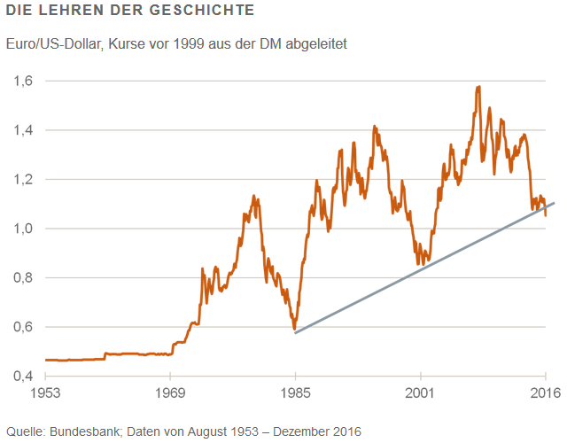 Schließlich spricht für einen starken Dollar der desolate Zustand Europas. Großbritannien verlässt die EU, in der Währungsunion nehmen die Spannungen zwischen Nord und Süd wieder zu, die Banken haben Probleme und die Renditen sind so niedrig, dass sie keinen Investor hinter dem Ofen hervorlocken. Wer will in einem solchen Umfeld noch Euros haben?