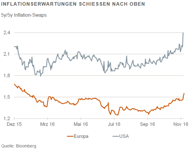 Die Finanzmärkte setzen auf ein großes Wachstumsprogramm des Präsidenten mit Infrastrukturinvestitionen, Steuersenkungen und Deregulierung. Die Zunahme des realen BIPs, die in diesem Jahr in den USA auf unter 2 % gefallen war, könnte wieder auf früher gewohnte Niveaus von 3 % und mehr steigen. Da es inzwischen Vollbeschäftigung gibt, würde dies zu höheren Löhnen und Preisen führen. Das wird zwar noch nicht 2017 voll durchschlagen, wohl aber 2018. Natürlich wird sich der Wachstumseffekt durch Handelsrestriktionen und die Beschränkung der Einwanderung (beziehungsweise die Abschiebung von illegalen Immigranten) etwas abschwächen. Andererseits steigt die Inflation dadurch umso stärker.