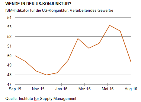 In den letzten Wochen wurde ich bei meinen Erwartungen über die weitere wirtschaftliche Entwicklung etwas unsicher. Zuerst stürzte der Einkaufsmanagerindex des Institutes for Supply Management für die amerikanische Industrie regelrecht ab (siehe Grafik). Wenige Tage danach zeigte sich das gleiche Bild bei dem entsprechenden Index für die Dienstleistungen. Beide Indizes waren in der Vergangenheit immer relativ verlässlich. Gleichzeitig gab es auch in Europa schlechte Nachrichten. Die Industrieproduktion in Frankreich und Deutschland ging zurück. Der bekannte ifo-Index schwächte sich erheblich ab.