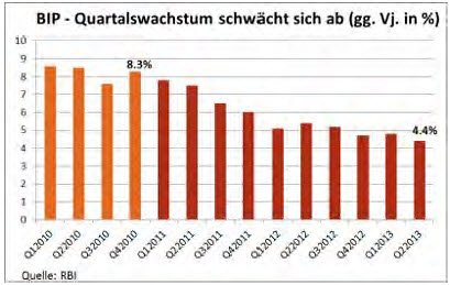 Die Abschwächung des Wirtschaftswachstums setzt sich in Indien stetig fort. Von 2000 bis 2010 legte das BIP im Jahresdurchschnitt um 7,5 Prozent zu. Seitdem verliert das Wachstum an Fahrt. „Im Fiskaljahr 2012/2013 wurde mit einem Zuwachs von fünf Prozent der niedrigste Wert der vergangenen Dekade gemessen“, so Cecchi. Im laufenden Fiskaljahr 2013/2014 habe das BIP im ersten Quartal jedoch um 4,4 Prozent gegenüber dem gleichen Vorjahresquartal zulegen können. „Für das gesamte Fiskaljahr wird bestenfalls ein Wachstum von 4,2 Prozent erwartet, deutlich unter Potenzial“, bremst der Analyst alle Erwartungen. Die Wirtschaft des Subkontinents leide unter dem schwachen globalen Umfeld und den Folgen von Kapitalabflüssen. „Doch Indiens Wirtschaftskrise ist in erster Linie hausgemacht und auf eine schlechte Wirtschaftspolitik und das jahrelange Ausbleiben von Strukturreformen zurückzuführen“, sagt Cecchi. Inzwischen habe der Abschwung einen Tiefpunkt erreicht, der unter dem normalen Konjunkturverlauf liege. „Die Importe müssen zurückgefahren und die Inflation bekämpft werden“, fordert der Experte. „Unternehmerfreundliche Maßnahmen sind von Nöten, um das Vertrauen der Investoren zu verbessern und sicherzustellen, dass die Zahlungsbilanz ohne Erhöhung der Auslandsverschuldung ausgeglichen werden kann.“ Zudem müsse der Wechselkurs der Rupie stabilisiert werden. Sollten die Ungleichgewichte dadurch korrigiert werden, könne sich das Wachstum stabilisieren, bevor es mittelfristig wieder auf einen höheren Wachstumspfad zurückfinde. „Doch ohne einschneidende Reformen (des Staatshaushalts, des Einzelhandels für Nahrungsmittel, etc.) wird Indiens Wirtschaft nicht mehr seine Potenzialwachstumsrate von acht Prozent erreichen und voraussichtlich bis 2018 bestenfalls mit Wachstumsraten in der Größenordnung von 6,7 Prozent zulegen.“