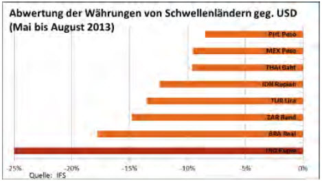 Die anhaltend hohe Inflationsrate von voraussichtlich zehn Prozent im Jahresdurchschnitt halte die RBI davon ab, die Geldpolitik zu lockern. Dies belaste die Finanzierungkosten der Unternehmen und führe zu einem Aufschub privater Investitionen. Für den fortbestehenden Inflationsdruck macht Cecchi eine strukturelle Ursache aus: „Die Verbraucherpreise steigen aufgrund der ineffizienten Lagerung und Verteilung der Nahrungsmittel. Zudem werden sie durch steigende Importpreise in Verbindung mit der schwächeren Rupie angeheizt.“ Zwischen Mai und August wertete die indische Rupie um 25 Prozent gegenüber dem US-Dollar ab. Zwar sei eine Abwertung absehbar gewesen, da die Währung als überbewertet galt. Geschwindigkeit und Ausmaß waren jedoch überraschend.