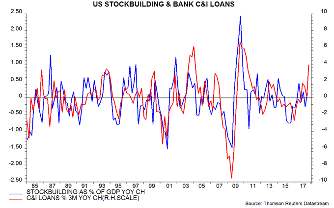 The year-on-year change in three-month C&I loan growth rose to its highest since 2011 in December, suggesting that stockbuilding will have made a strong positive contribution to year-on-year GDP growth in the fourth quarter – second chart. The level of the impulse is consistent with a cycle peak, i.e. the stockbuilding contribution is likely to weaken and turn negative over coming quarters, with “multiplier” effects on other GDP expenditure components.