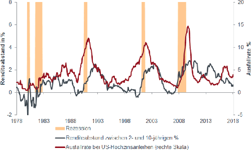 Abbildung 1: Renditeabstand zwischen 2- und 10-jährigen US-Treasuries und Ausfallrate bei US-Hochzinsanleihen