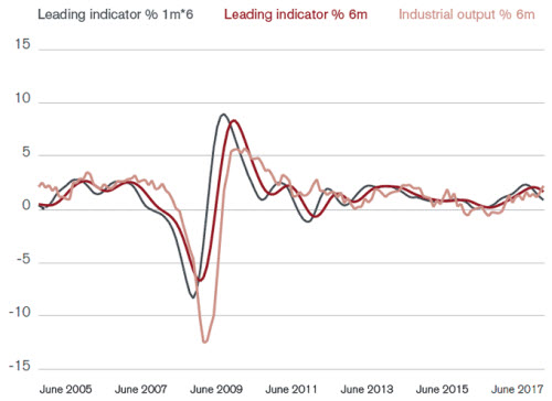Global growth strengthened in late 2016/early 2017 and investors are upbeat about prospects. Monetary trends and leading indicators, however, suggest that momentum will cool over the summer, posing a risk to high-flying markets – particularly if the Federal Reserve continues to tighten policy.Six-month growth of global* industrial output reached a three-year high in April 2017 – see figure 1. Strength had been predicted by a rise in six-month growth of real (i.e. inflation-adjusted) narrow money** to a peak in August 2016. Turning points in real money growth have led those in output growth by nine months on average historically.