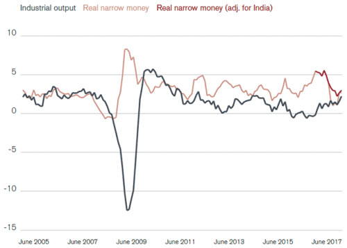 Real money growth, however, fell sharply between August 2016 and February 2017. Weakness was exaggerated by India’s demonetisation programme but a significant slowdown occurred elsewhere. Allowing for the usual lead, this suggested that output growth would slow from spring 2017.