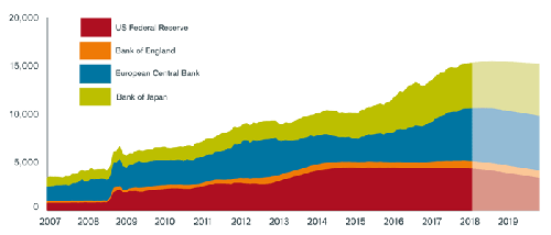 Die Ergebnisse der letzten Sitzung des Offenmarktausschusses der US-Notenbank im Jahr 2017 deuten darauf hin, dass die Währungshüter 2018 den Leitzins um rund 75 Basispunkte anheben und zugleich die Zentralbankbilanz durch Drosseln der quantitativen Lockerung (QE) verkleinern werden. Zwar dürften die Bank von Japan und die Europäische Zentralbank unter dem Strich weiter Vermögenswerte kaufen. Aber in diesem Jahr könnten wir den Punkt erreichen, ab dem die Käufe der wichtigsten Zentralbanken insgesamt sinken werden (siehe Grafik 1). In die Bresche werden die verglichen mit den Zentralbanken in der Regel preissensibleren Anleger springen müssen, weshalb wir uns auf höhere Renditen und sinkende Anleihekurse gefasst machen müssen.