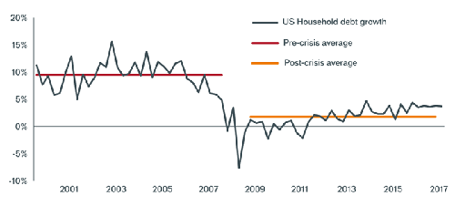 John Pattullo, neben Jenna Barnard als Co-Fondsmanager für den Fonds verantwortlich, pflichtet ihr bei: „Bei den Renditen könnte es kurzzeitige, (und kleine) zyklische Aufwärtsbewegungen geben. Aber die langfristig günstigen strukturellen Kräfte für Anleihen bleiben intakt.“ Die strukturellen Kräfte, auf die er sich bezieht, sind die demografische Entwicklung mit einer alternden Bevölkerung, die deflationären und Arbeitskräfte ersetzenden Effekte der technologischen Entwicklung und die Verhaltensänderungen nach der Finanzkrise. Letztere haben dazu geführt, dass der private Sektor trotz historisch niedriger Zinsen zurückhaltender in Sachen Kreditaufnahme geworden ist (siehe Grafik 2).