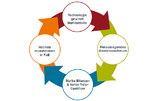 Auch Anfang 2018 verbuchen Technologieaktien höhere Kursgewinne als der breite Aktienmarkt. Die fünf Technologieriesen Apple, Amazon, Alphabet, Facebook und Microsoft haben damit zusammen nun eine Marktkapitalisierung von derzeit rund 3,6 Billionen US-Dollar und verfügen über eine Nettobarposition von über 365 Milliarden US-Dollar. Aus den letzten Quartalsberichten der großen Fünf wird deutlich, dass Cash-Generierung, Investitionen und Marktanteilsgewinne eine Positivspirale in Gang gesetzt haben. Zu verdanken ist sie dem sich immer schneller drehenden Schwungrad im Technologiesektor, mit dem die Branche und ihre Fähigkeit, sich weitere Marktanteile zu sichern, immer stärker Fahrt aufnehmen.