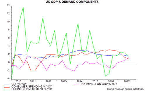 According to the new data, the improvement in net export performance in 2017 was impressive and has offset a significant slowdown in household consumption, with business investment growth modest but stable – see first chart. Overall investment growth has been slightly higher because of a strong housing contribution.