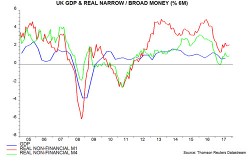 The rise in real narrow money growth since April 2017 reflects a modest recovery in the household component, which had weakened significantly in late 2016 / early 2017, warning of a consumption slowdown. This recovery suggests that consumer prospects are improving at the margin.