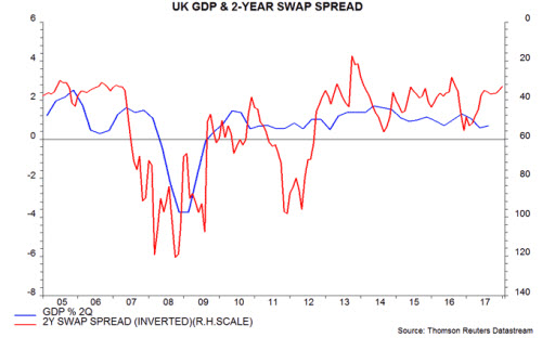 The signal that overall growth will hold up in 2018 is supported by a narrowing of the two-year swap spread, which has been an inverse leading indicator of economic performance historically – third chart.