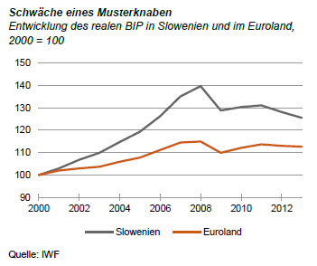 Andererseits hat Slowenien eine solide wirtschaftliche Basis. Es hat gut ausgebildete Arbeitnehmer. Viele renommierte Firmen haben sich in dem Land angesiedelt (unter anderem Siemens, Bosch, IBM, Microsoft). Über Jahre ist die Wirtschaft schneller gewachsen als die Eurolands (siehe Grafik). Die Staatsverschuldung des Landes lag im vorigen Jahr bei nur 54 % der Wirtschaftsleistung (Deutschland 82 %).