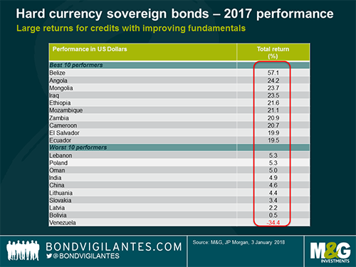 Mit Ausnahme von Venezuela und der Türkei gab es kein Land, in dem Anleihen Verluste brachten. Insgesamt dienten dabei die Lokalwährungen als Kurstreiber: „Ein relativ schwächerer US-Dollar, leicht erhöhte Rohstoffpreisen und ein Abbau der Inflation in vielen Schwellenländern sorgte für eine gute Entwicklung im vergangenen Jahr“, sagt Claudia Calich, Fondsmanagerin des M&G Emerging Markets Bond Fund.