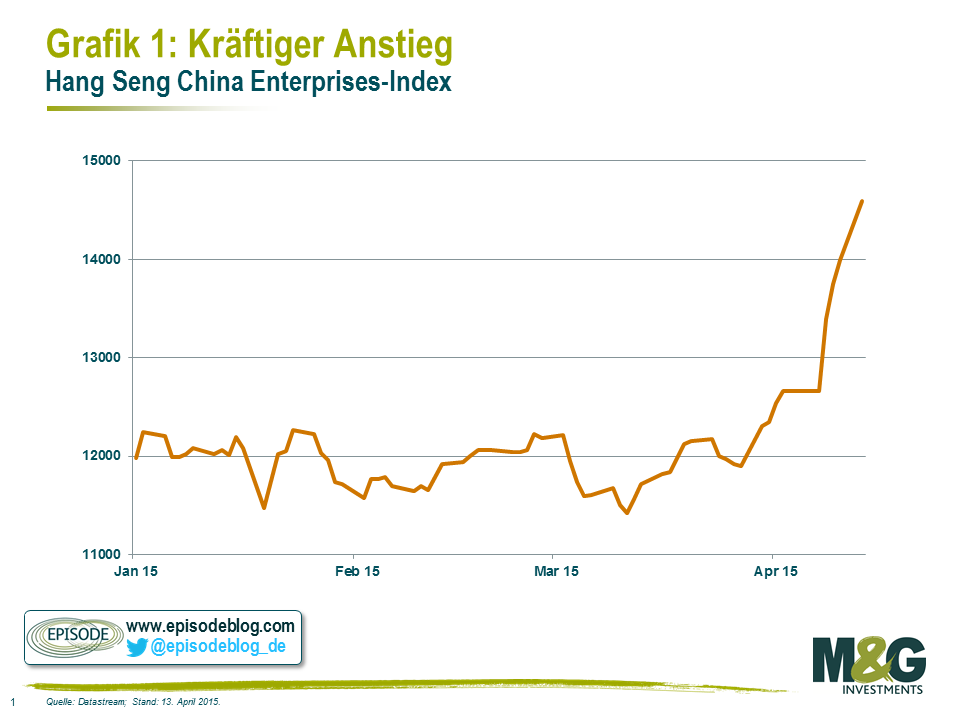 Falls Sie Anfang April – also am Freitag vor drei Wochen (dem 27. März 2015) in chinesische Aktien investiert haben sollten, die in Hongkong börsennotiert sind (sogenannte H-Werte), wären Sie acht Handelstage später stolze 23 Prozent reicher gewesen.