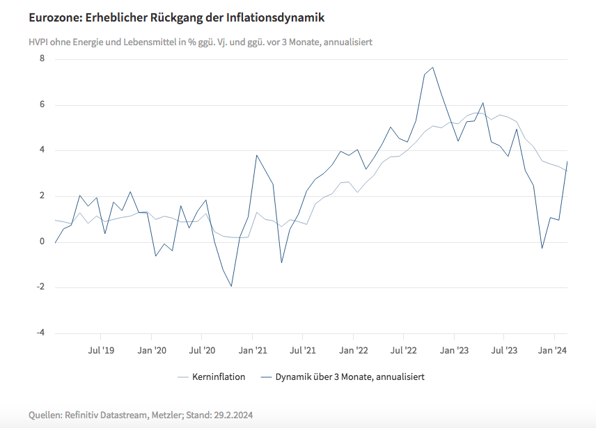 Wir gehen davon aus, dass der „hohe“ Februarwert ein Ausrutscher war, da viele Wirtschaftsakteure nur einmal im Jahr zu Jahresanfang ihre Preise anpassen und aufgrund der hohen Inflation 2023 die Preisanpassungen dieses Mal höher als normal ausfielen. Daher bestehen gute Chancen für eine wieder langsamere monatliche Dynamik der Kerninflation (Mittwoch) im März. Wir erwarten dementsprechend einen Rückgang der Kerninflation von 3,1 Prozent im Februar auf 2,9 Prozent im März.