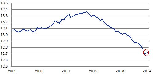 Die Bankbilanzen am 31.12.2013 sind die Grundlage für den Stresstest und das Prüfen der Bilanzqualität (Asset Quality Review). Vor diesem Hintergrund bereinigten die Banken vor diesem Stichtag ihre Bilanzen in erheblichem Umfang, und zwar um 5 Billionen EUR; zudem zeigten sie eine große Vorsicht bei der Vergabe neuer Kredite. Im Januar stiegen die Kreditvergabe und die Geldmengen seit langem wieder in nennenswertem Umfang.