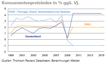 Schon damals wurden Inflationsraten von über 3 % für Deutschland diskutiert. Die erwartete Inflationsdivergenz zwischen der Peripherie und Kerneuropa ist eine notwendige Voraussetzung, um die Wettbewerbsfähigkeit wieder anzugleichen und die außenwirtschaftlichen Ungleichgewichte zu bereinigen.
