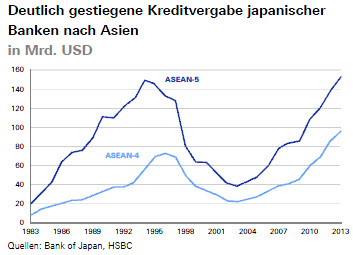 Der Kapitalabfluss westlicher Investoren aus den asiatischen Schwellenländern infolge der Wende in der US-Geldpolitik wird somit zumindest teilweise ausgeglichen durch die Effekte der ultralockeren Geldpolitik der Bank of Japan auf die Kreditvergabe der japanischen Banken.