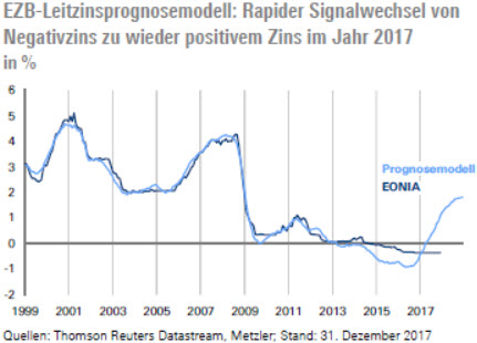 Trotz aller mit der Digitalisierung verbundenen Unsicherheiten ist es unzweifelhaft, dass die Wirtschaft in der Eurozone boomt, wie ein BIP-Wachstum (Dienstag) von etwa 0,6 % im vierten Quartal mit aller Wahrscheinlichkeit bestätigen wird. Gleichzeitig dürfte auch die Inflation (Mittwoch) von noch -0,6 % im Januar 2015 auf voraussichtlich 1,2 % im Januar 2018 gestiegen sein. Da die Europäische Zentralbank (EZB) ihre Geldpolitik immer noch an diesen Kenngrößen orientiert, haben fundamentale Zinsprognosemodelle wahrscheinlich immer noch eine Berechtigung. Wobei es ehrlicherweise auch schon vor der Digitalisierungswelle eine große Herausforderung war, die EZB-Geldpolitik mithilfe von Fundamentaldaten in einem Regressionsmodell zu erklären und zu prognostizieren.