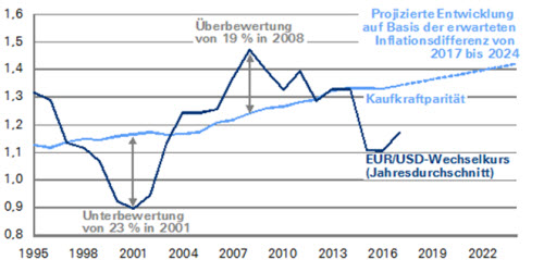Eine andere Methode ist die Wechselkursentwicklung des Euros gegenüber dem US-Dollar mit Hilfe der Kaufkraftparität zu projizieren. So liegt nach Berechnungen der OECD derzeit die Kaufkraftparität bei etwa 1,33 EUR/USD. Unterstellt man entsprechend der Inflationsswaps eine um 0,8 %-Punkte pro Jahr höhere Inflation in den USA als in der Eurozone, würde die Kaufkraftparität bis auf 1,42 EUR/USD im Jahr 2024 steigen. Eine Rückkehr des aktuellen Wechselkursniveaus über sieben Jahre zur Kaufkraftparität würde für Anleger einen Verlust von durchschnittlich etwa 2,8 % pro Jahr bedeuten. Wechselkurse neigen jedoch zum Überschießen, sodass sogar größere Wechselkursverluste für Anleger entstehen könnten. Ein Blick in die Vergangenheit zeigt, dass der Euro schon um etwa 20 % über- oder unterbewertet war. Würde der Euro also in sieben Jahren in eine Überbewertung von 20 % laufen, könnte für Anleger im schlimmsten Fall sogar ein Verlust von durchschnittlich etwa 5,5 % pro Jahr infolge der Wechselkursentwicklung entstehen.